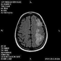 Уважаемый Евгений! Очень бы хотелось видеть картину Т2 ВИ в обычном FSE и сагиттальные срезы IR, особенно в данном конкретном случае. Согласен с вами. Сгоряча поставил бы в дифференциальном ряду первым обширный острый ишемический инсульт, особенно если это первые часы заболевания и если было острое начало. Но, поскольку нет характерного накопления контрастного вещества, преимущественно по ходу борозд, а так же распространенность процесса и его очаговость не типичны, задумался бы глубже. Не томите, раскройте тайну :) А ВИЧ вы, случайно, в анамнезе не обнаружили?