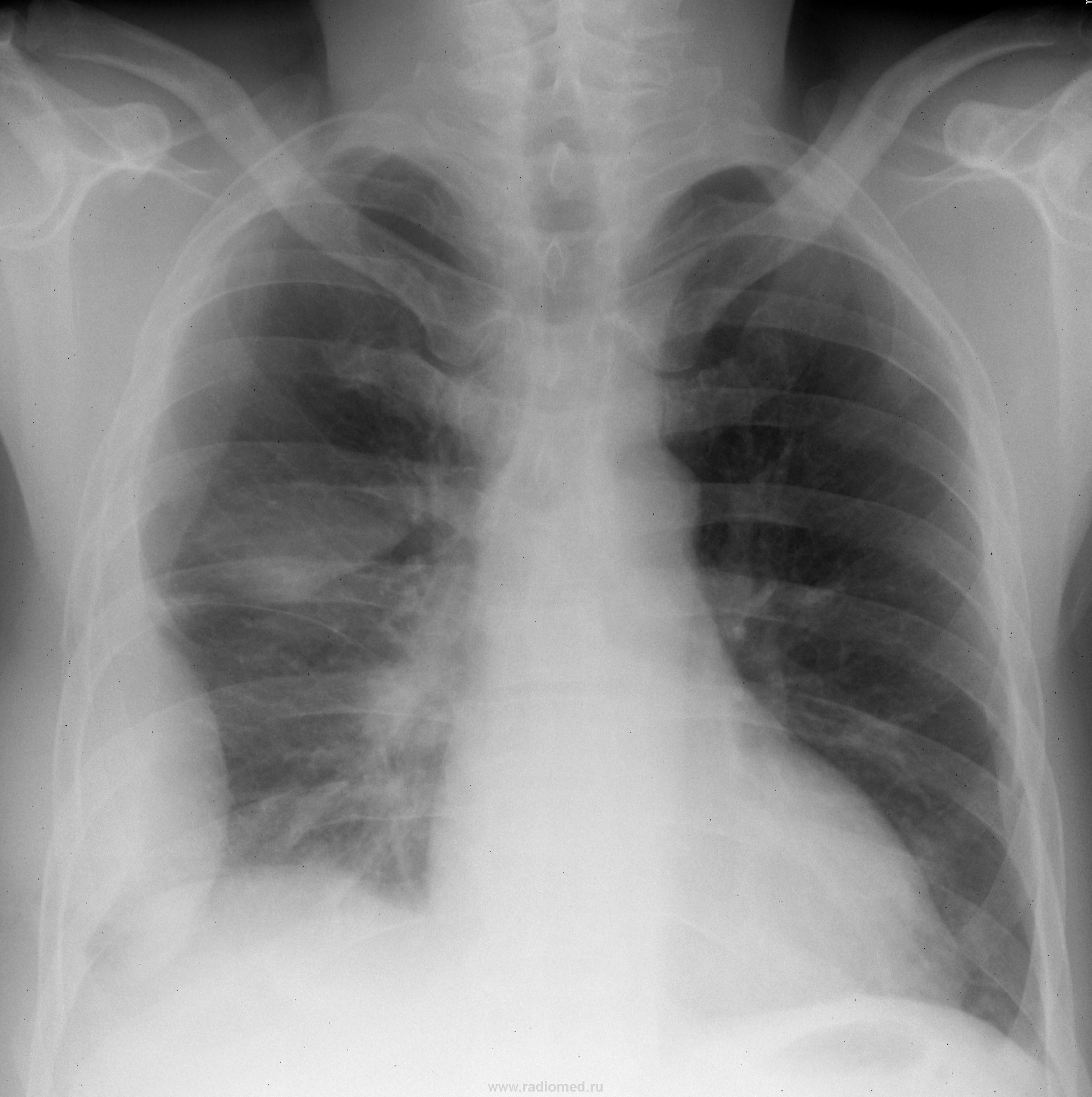 Пол пациента: Мужской пол Тип патологии: Другое Область исследования: Грудная клетка и верхние дыхательные пути Методы исследования: Rg Мужчина 50 лет. Жалобы на одышку, недомогание, боль в грудной клетке. Лабораторных показателей нет. https://radiomed.ru/sites/default/files/styles/case_slider_image/public/user/837/00000321.JPG?itok=c3sQzWdN ID:2384 Tue, 30/03/2010 - 20:13 #1 Катенёв Валенти... Offline Last seen: 7 years 1 month ago Joined: 22.03.2008 - 22:15 Posts: 54876 Паракостальный правосторонний осумкованные выпоты - латеральный и небольшой задний. Правосторонний интерлобарный в верхних отделах главной междолевой щели. По всей видимости и базальный (наддиафрагмальный) осумкованный. Tue, 30/03/2010 - 20:23 #2 brainmodel Offline Last seen: 3 months 1 week ago Joined: 18.03.2010 - 22:04 Posts: 2881 Осумкование плеврита: по боковой, задней поверхности, задней междолевой. Наддиафрагмальный компонент. Короче, повторяю слова В.Л. Verum plus uno esse non potest. Tue, 30/03/2010 - 21:05 #3 Грицько Виталий Offline Last seen: 9 years 2 weeks ago Joined: 05.01.2010 - 14:06 Posts: 1058 Согласен с коллегами. А на корень справа в динамике внимание бы обратил. Tue, 30/03/2010 - 21:21 #4 Катенёв Валенти... Offline Last seen: 7 years 1 month ago Joined: 22.03.2008 - 22:15 Posts: 54876 Грицько Виталий wrote: Согласен с коллегами. А на корень справа в динамике внимание бы обратил. В динамике - "да". Но лучше оттомографировать. Sat, 04/03/2017 - 23:51 #5 Катенёв Валенти... Offline Last seen: 7 years 1 month ago Joined: 22.03.2008 - 22:15 Posts: 54876 Интересное наблюдение.