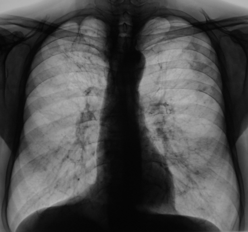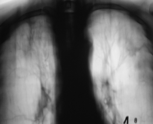 4 месяца тому пациент "взят на контроль". Произведено дообследование пациента - рентгенография, линейная томография в прямой проекции. Был заподозрен инфильтративный туберкулёз левого лёгкого в фазе распада. Пациент был направлен в противотуберкулёзный диспансер, диагноз был подтвержден. Было проведено "специфическое лечение".