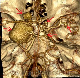 Представляю множественные мешотчатые аневризмы сосудов гловного мозга, помечены красными стрелками. Женщина средних лет. Клинику уже не помню, случай уже давний.