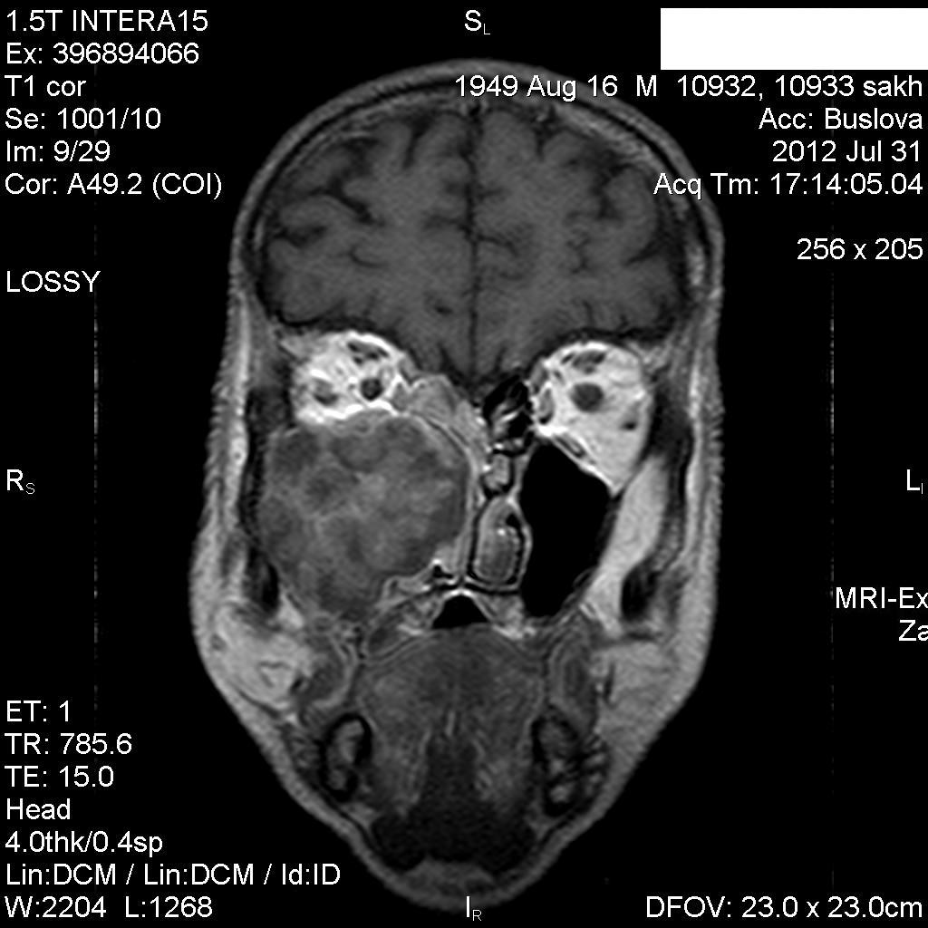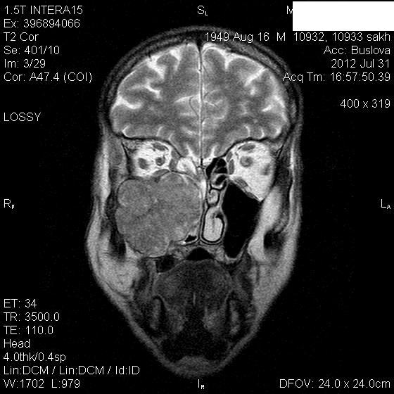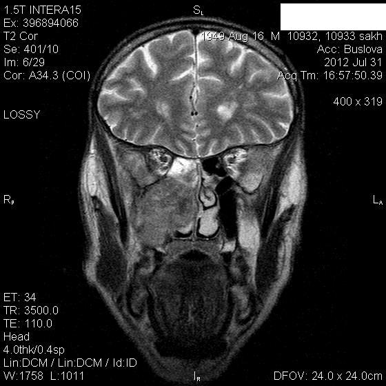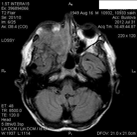 Мужчина лечился около месяца от правостороннего гайморита.Неоднократно пунктировали.Выписался из стационара, через 3 дня попал к другому ЛОР-врачу, который направил пациента на КТ, но волею судеб он оказался у нас.Визуально: незначительный экзофтальм справа, отек скуловой области, который периодически исчезает.Пыталась добыть его рентгеновский снимок пазух через знакомого отоларинголога, вхожего в лечебное учреждение, где лечился пациент-бесперспективно ( просто исчез, со слов лечащего врача-обычный правосторонний гайморит), хотя просила всего-то для себя, чтобы самой в такую ситуацию не попасть.