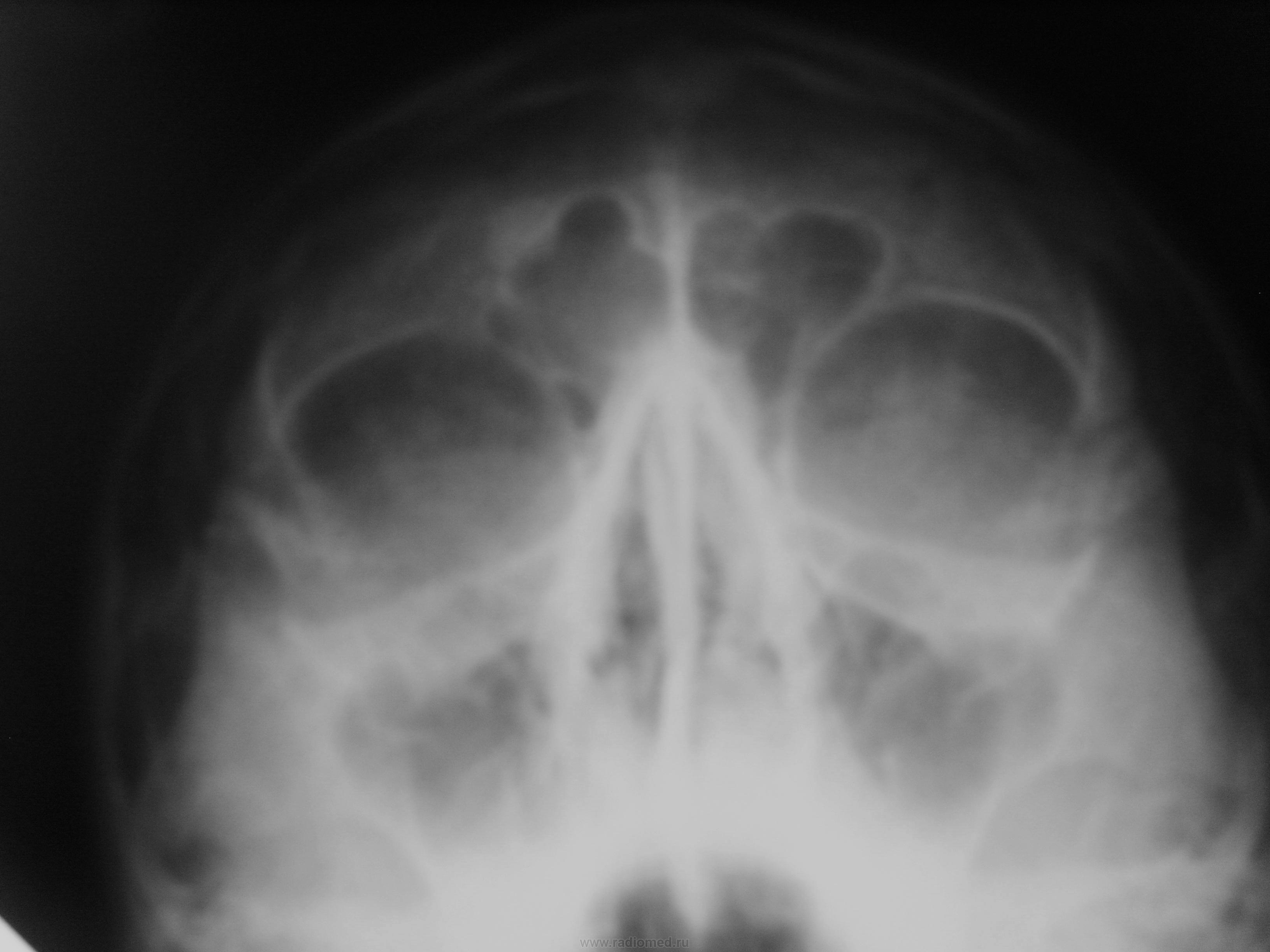 пристеночное понижение пневматизации верхнечелюстных пазух, больше - правой, ячеек решетчатой кости и фронтальной пазухи за счет отека слизистой оболочки.]