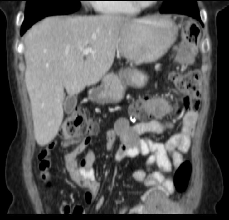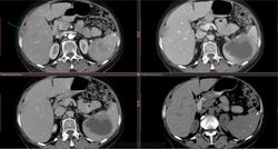 Поджелудочная железа - головка-тело-хвост размерами 2.2*1.9*1.8 см, денситометрическая плотность 36Х-34Х-32Х соответственно. При контрастировании определяется однородное накопление контраста 101Х-109Х-96Х.