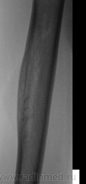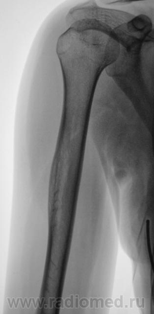 Пациентка направлена врачом хирургом на рентгенографию правой плечевой кости. Пациентка жалуется на боли в плече, как дневные, так и ночные, отмечает, что эти боли усиливаются при физической нагрузке. Из "разговора" выяснено, что боли резко усилились в течение последних двух месяцев. Пациентка отмечает, что боли усиливаются при физической нагрузке. Выяснено, что 1,5 года тому был удар (упала), в то место, которое болит. Что посоветуете, уважаемые коллеги?