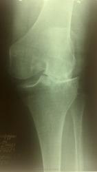 Мысль про асептический некроз мыщелка бедра посещала меня, но на боковой проекции совсем ровный контур обоих мыщелков, хотя и нечёткий - "мешают" межмыщелковые бугорки. Может, прямую проекцию всё-таки повторим... в должной укладке и без поворотов?)