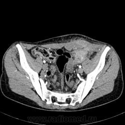 Бог его знает, что это... Может, автор подскажет? но уж очень выраженное накопление контраста, держится прилично и видно зоны некроза, отек клетчатки, жидкость в тазу...