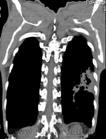 На фоне консолидации полость без содержимого. Может быть всё что угодно, что сопровождается деструкцией. Нужны ещё томограммы в лёгочном окне.