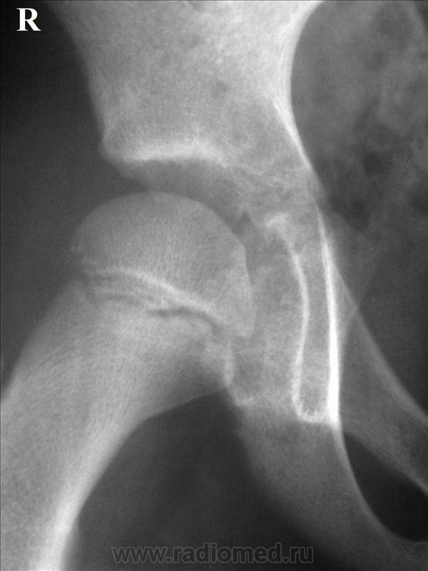 Случай по дежурству. Мальчик 8 лет. стал испытывать боль в правой нижней конечности около недели назад, несмотря на это продолжал активно заниматься футболом. Вчера боль в т\бедренном суставе резко усилились, появилось вынужденное положение, незначительная ротация бедра кнутри, и сгибание коленного сустава 175 гр, осевая нагрузка на нижнюю конечность не возможна из-за выраженного болевого синдрома, температура 37,4, в ОАК лейкоцитоз 13.4, палочки 9, СОЭ 28 мм\час. На рентгенограмме т\бедренных суставов мне не понравился медиальный участок суставной поверхности головки правого бедра. Можно ли данный случай считать начальным проявлением болезни Пертеса?