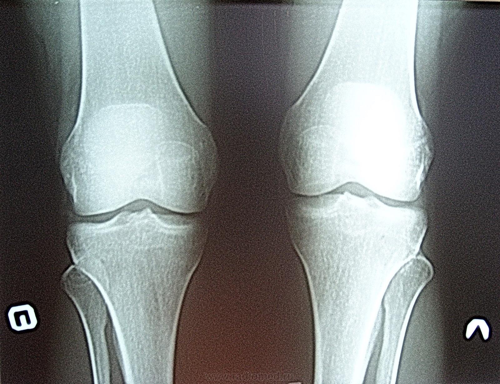 Молодая женщина 25 лет пришла самостоятельно на рентген коленных суставов, точнее правого. Левый - решила сделать "для кучи". Меня заинтересовала правая м\берцовая кость, точнее её метафизарный отдел, по сравнени. с левой. Со слов женщины боли сильные в правом коленном суставе. Травм не было. А какие ваши мнения уважаемые коллеги?