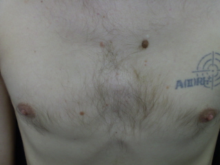 При осмотре пациент пониженного питания (с его слов и со слов матери «он всегда был худощавым»). Кожные покровы слегка желтушные. Слева по ходу грудино-ключично-сосцевидной мышцы пальпируется единичный плотноватый лимфатический узел величиной с горошину. Область, где ранее определялся на шее справа конгломерат лимфоузлов более 6 см. нет никаких изменений. На передней грудной стенке на уровне средней трети грудины определяется незначительное покраснение и припухлость мягкоэлластической консистенции.