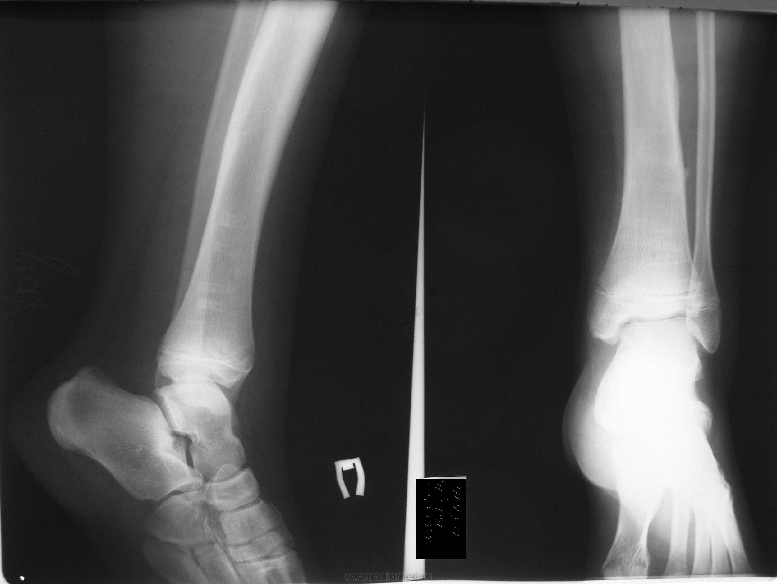Девочка, 12 лет предъявляет жалобы на боли в правом голеностопном суставе при нагрузке. Два года назад был перелом нижней трети большеберцовой кости с фиксацией винтами. Ваше мнение?