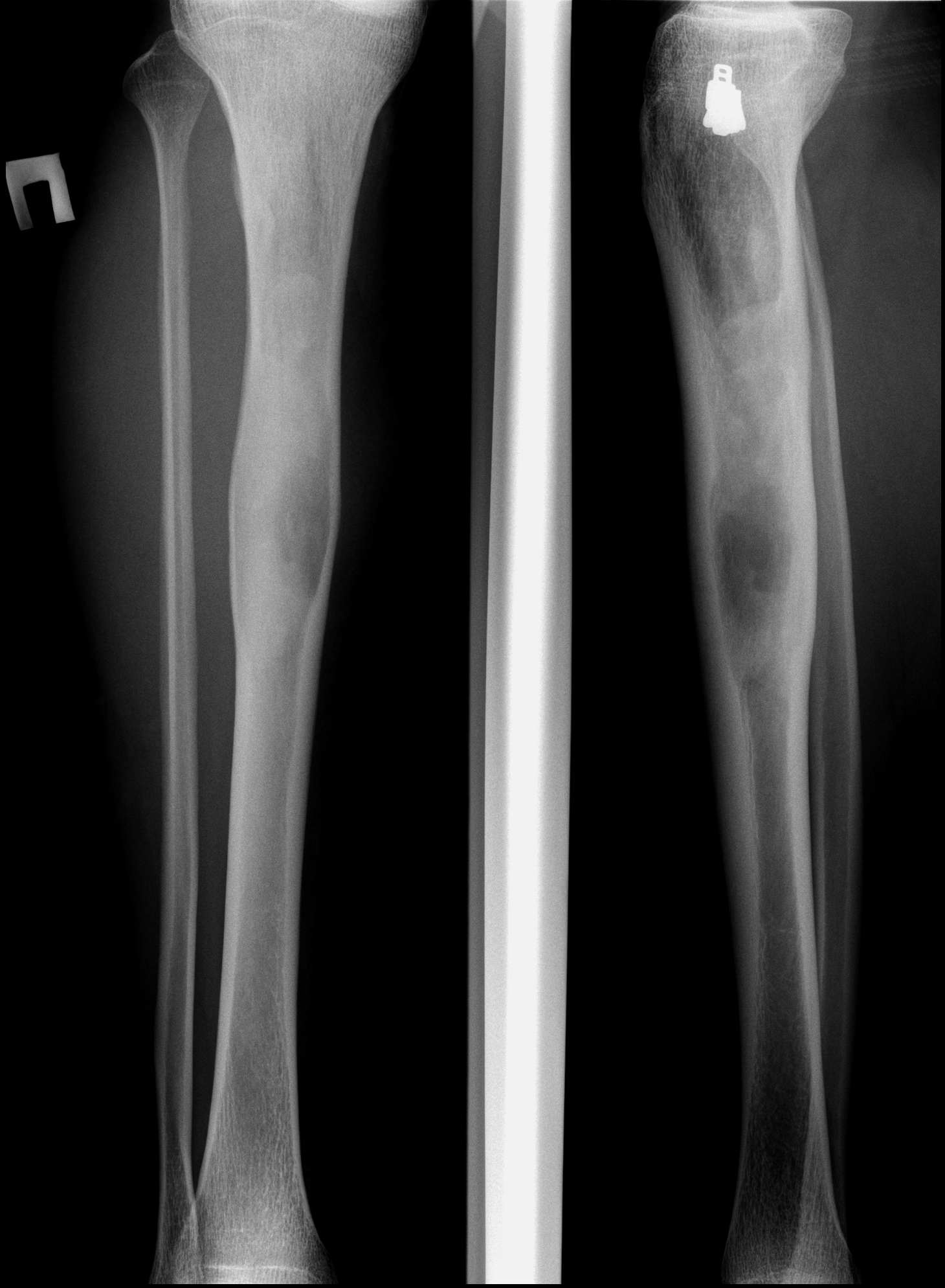 Молодой человек 29 лет, направлен травматологом в наше отделение на дообследования, с жалобами на болезненность в/3 б/берцовой кости справа и некоторую препухлость.