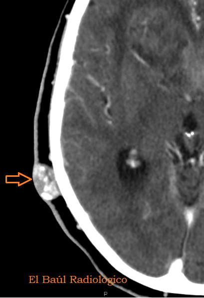 FIGURA 4) Otro quiste sebáceo, totalmente calcificado. Es redondo y está separado de la tabla externa del cráneo, característica que le distingue de un osteoma frontal.