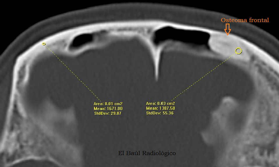 FIGURA 1) Pequeño osteoma frontal que depende de la tabla externa del cráneo. El aspecto es completamente diferente al de los quistes sebáceos, aunque la densidad puede ser parecida (1018 UH).