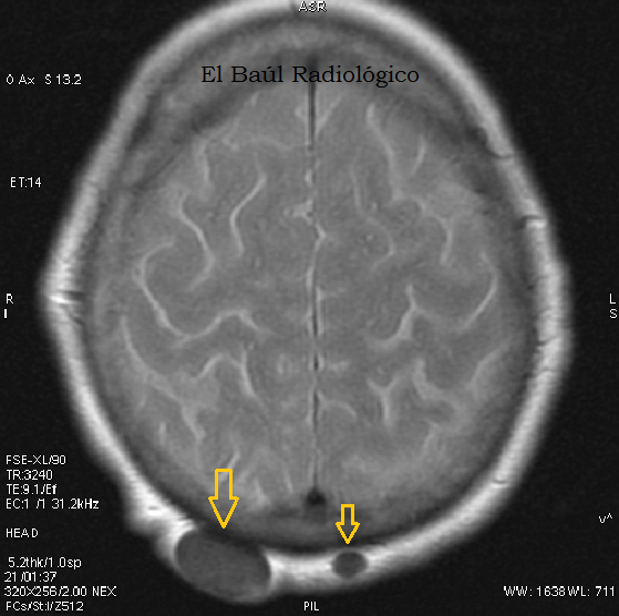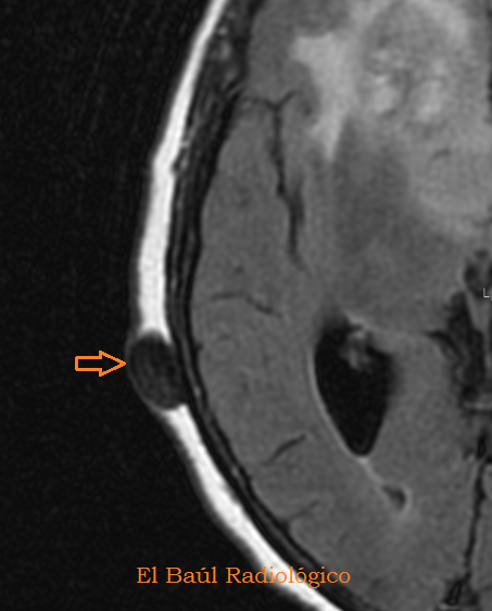 FIGURA 6) Los quistes sebáceos tambien se detectan en las exploraciones de TRM. Se presentan como un nódulo hipodenso, bien delimitado, que no tiene relación con el cráneo.