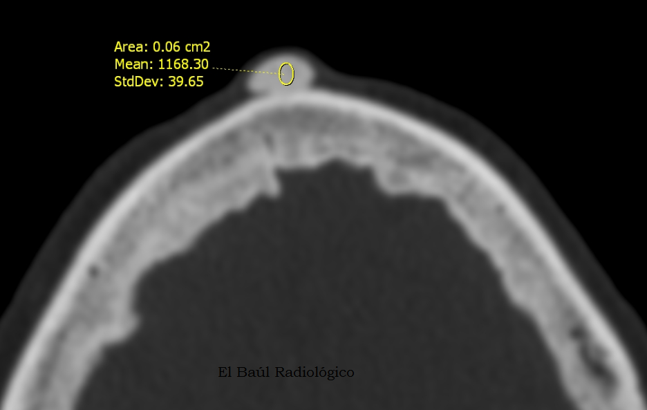 FIGURA 5) En los quistes sebáceos calcificados, la densidad puede ser muy elevada, tanto como la del hueso compacto, 1168 UH, pero no por eso pueden etiquetarse de osteomas.