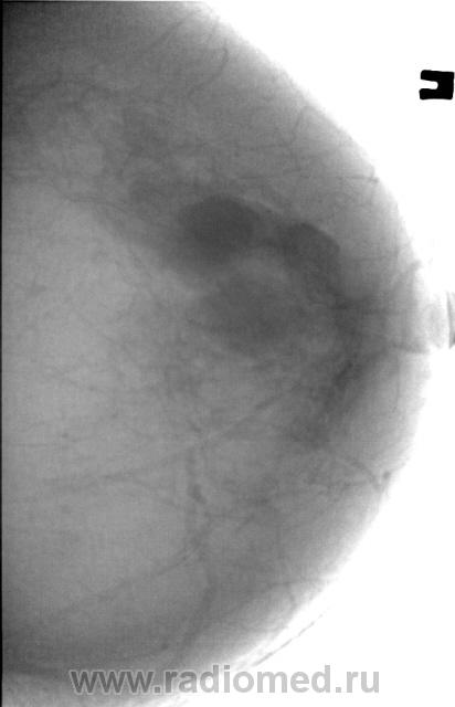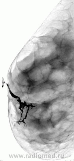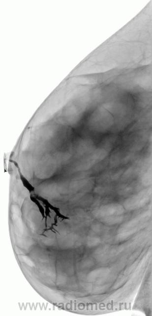 Пациентка предъявляет жалобы на наличие кровянистых выделений из протоко правой молочной железы в течение года. Проведено УЗИ, патологии не выявлено. Взяты мазки- отпечатки. Пациентка направлена "на дуктографию". Бужирован проток, с трудом введено 0,7 мл. контрастного вещества. Контрастирован проток в нижне-внутреннем квадранте правой молочной железы. Центральный проток равномерно расширен, определяется внутрипротоковое образование, контуры его ровные, чёткие. Данное образование практически обтурирует просвет протока.
