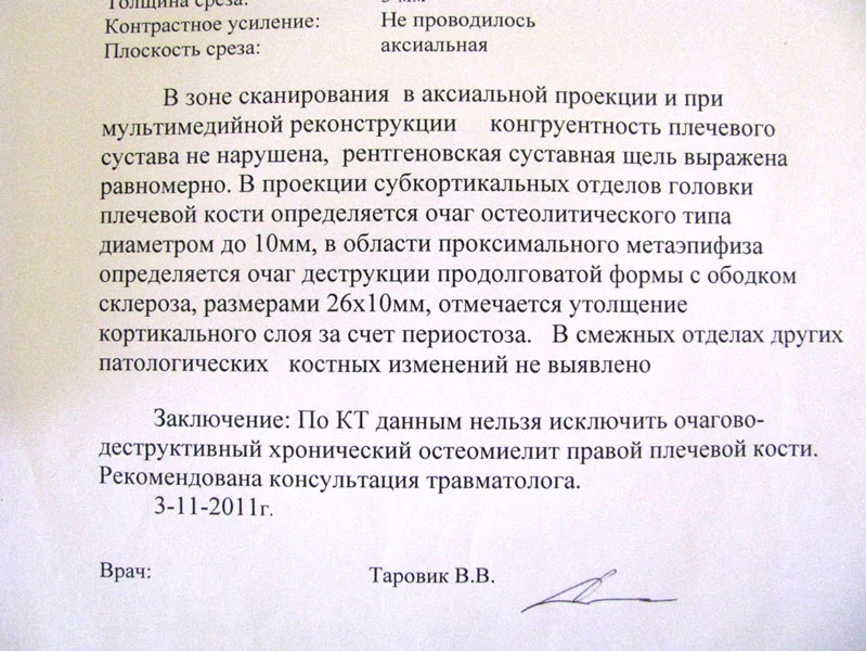Костномозговой канал правой плечевой кости сужен, по сравнению с левой кортикал равномерно циркулярно утолщен. Периостита и секвестров нет. Форма кости, кортикал сохранены. Это то, что увидела я по КТ.