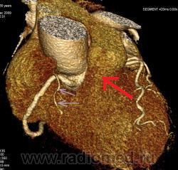 Вот еще вариант. Здесь левая коронарная артерия делиться на 3 ветви, кроме передней нисходящей и огибающей есть еще промежуточная ветвь (розовые стрелки).