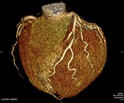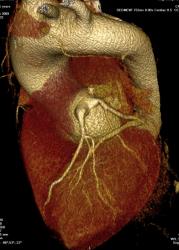 Мы недавно начали проводить КТ-коронарографию. Представляю вариант нормальных сосудов сердца. Довольно типичный вид, тип кровоснабжения преимущественно правый. Ствол левой коронарной артерии делится на ветви: переднюю нисходящую и огибающую.