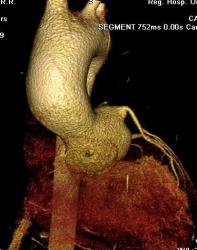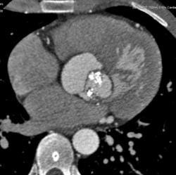 Двустворчатый аортальный клапанМужчина 35 лет с клиникой стеноза аортального клапана. На КТ выявлен двустворчатый клапан с обызвествлениями в створках. Луковица аорты и восходящий отдел значительно расширены. Отмечается также вариант отхождения левой коронарной артерии - левая передняя нисходящая и огибающая отходят непосредственно от аорты. Правая коронарная артерия гипопластична.