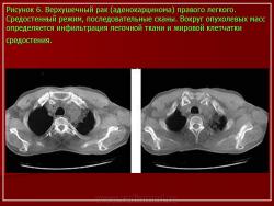 Рентгеновская компьютерная томография более чувствительна в выявлении инфильтративной формы рака, верхушечного рака, а также распада опухоли (рис. 5, 6, 7).
