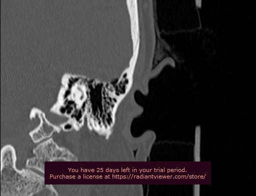 Женщина лет 50, беспокоит дискомфорт слева в заушной области. От левого поперечного отростка С1 позвонка есть костный выступ упирающийся в затылочную кость с формированием ямки как бы в виде...